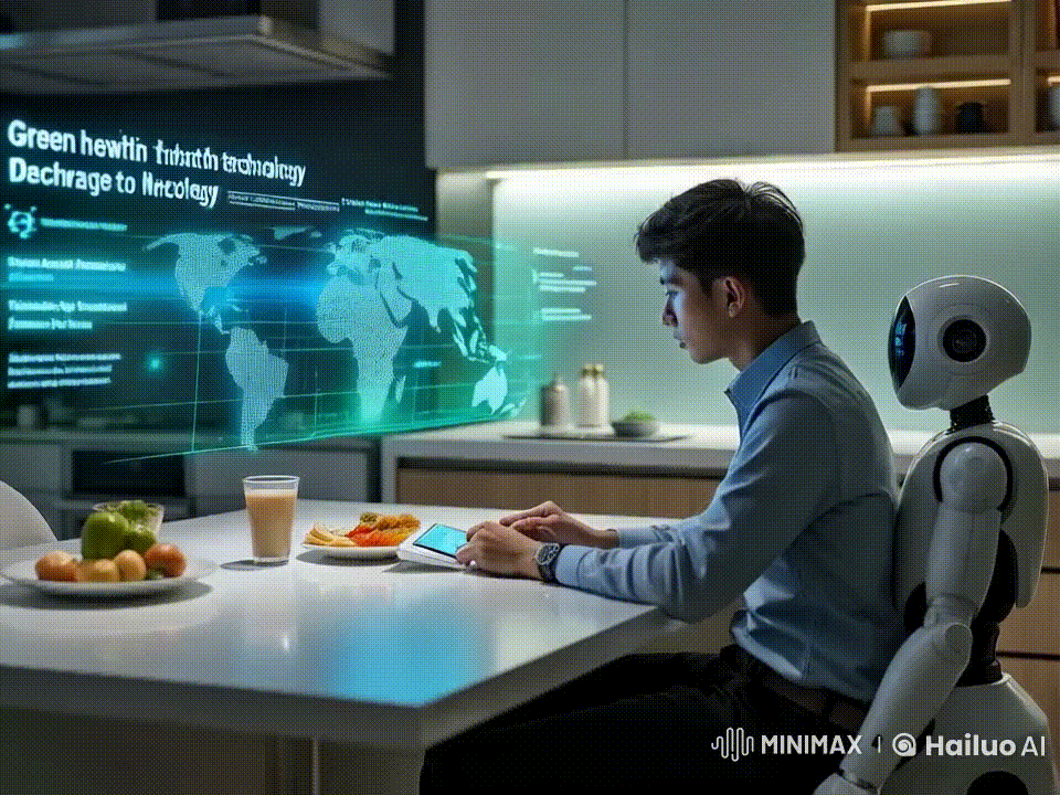 Di dapur, sarapan telah disiapkan oleh sistem otomatis. Hidangan dibuat dari bahan segar yang dipetik langsung dari kebun hidroponik di balkon apartemen. Sambil menikmati makanan, Raka membaca berita terkini yang terpampang di meja makan, proyeksi holografis yang mengikuti gerakan matanya. Dunia di tahun 2045 lebih sering dihiasi berita tentang teknologi hijau, penemuan medis revolusioner, dan rencana ambisius untuk eksplorasi antariksa.