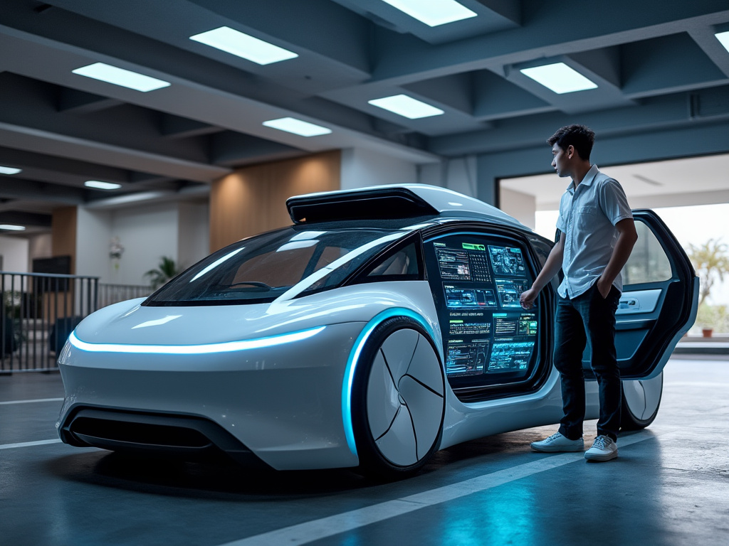 Setelah sarapan, Raka turun ke mobil otonomnya yang sudah menanti di bawah apartemen. Mobil ini, yang sepenuhnya bertenaga listrik dan didukung energi terbarukan, melaju mulus di jalanan kota tanpa kemacetan. Dalam perjalanan, Raka memanfaatkan dashboard augmented reality untuk menyelesaikan tugas kantor. Waktu perjalanan bukan lagi sekadar transit, melainkan momen produktif yang menyenangkan.
