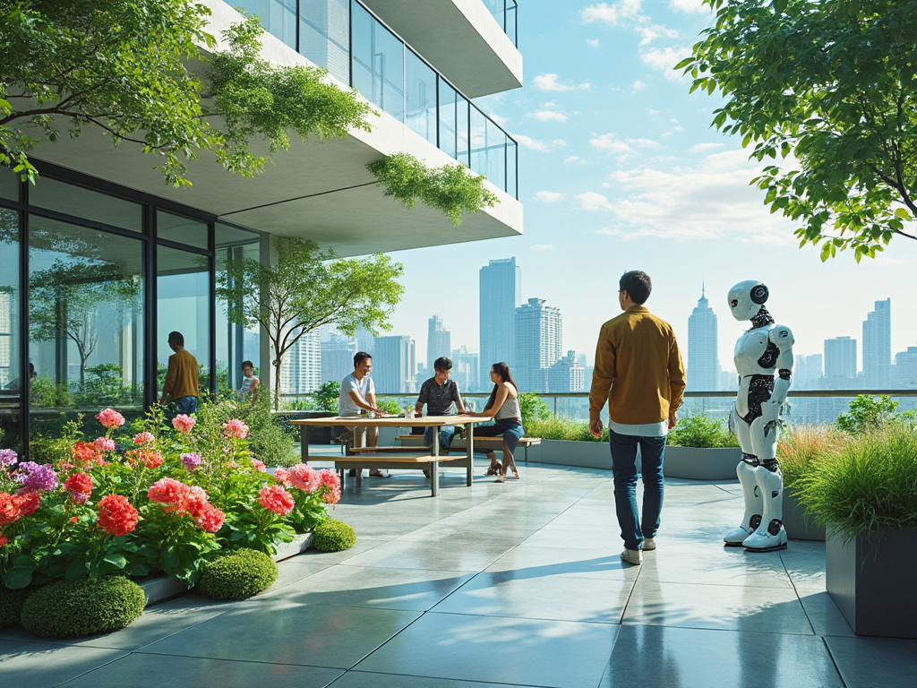 Ketika istirahat siang, Raka naik ke taman di atap gedung kantor. Di sana, ia menikmati udara segar dari sistem purifikasi udara kota sambil berbincang dengan kolega. Printer makanan 3D yang ada di sudut taman menyajikan camilan bernutrisi dengan bentuk yang unik, menjadikan makan siang lebih menarik.